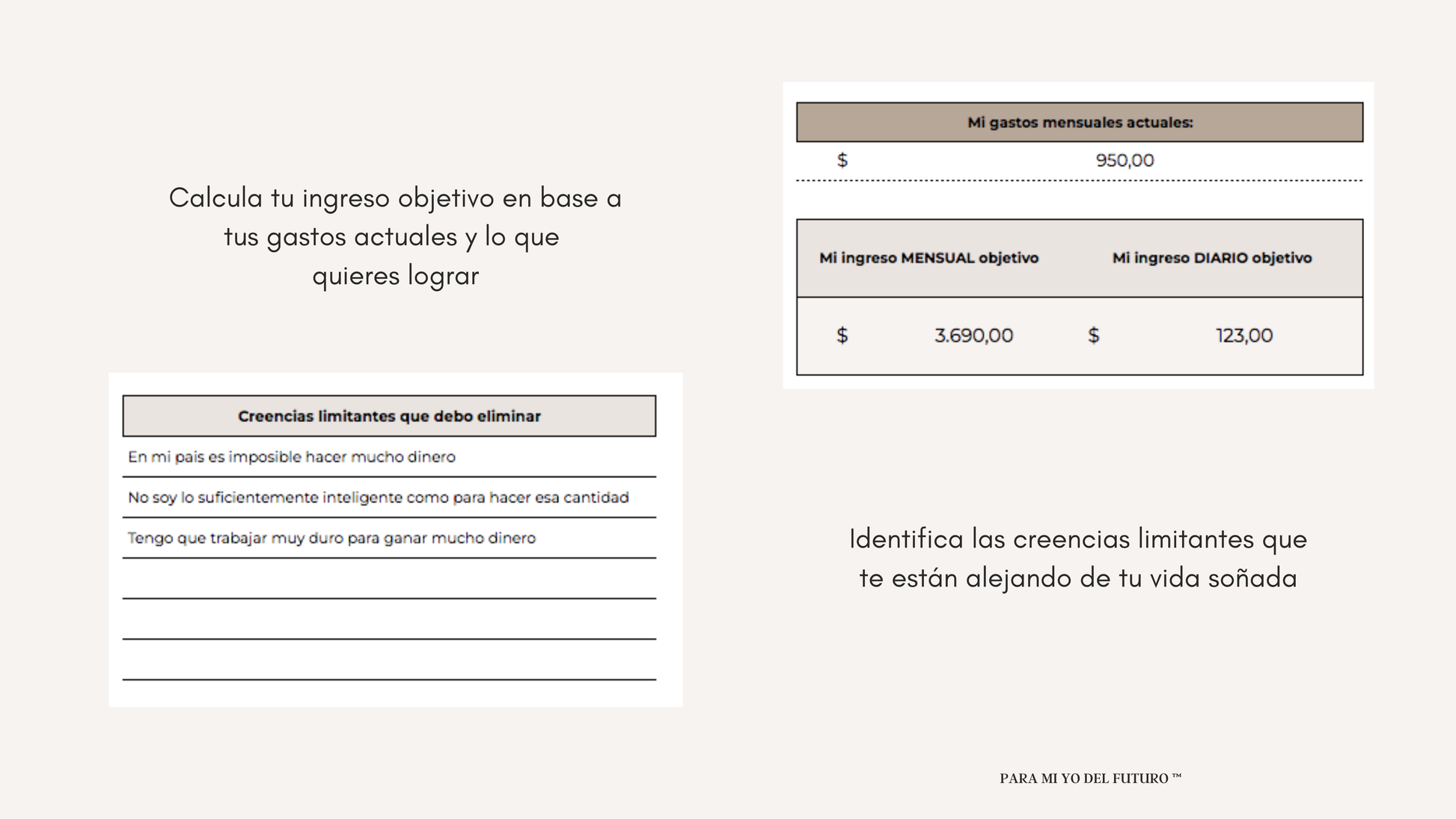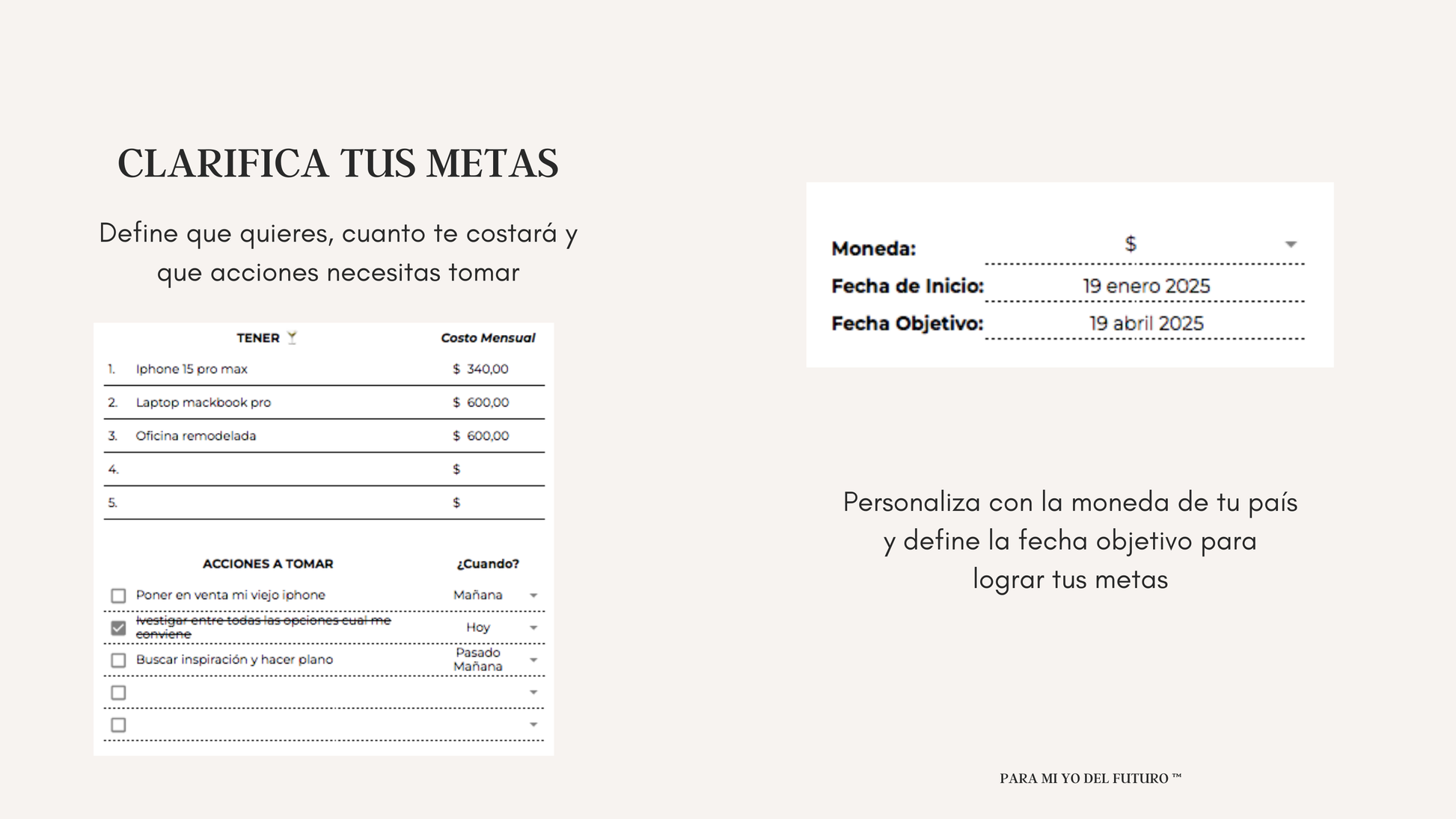 Este planner inspirado en la técnica "Onirograma" presentado por Tim Ferriss en su famoso libro La semana Laboral de 4 horas será tu guía para establecer objetivos claros, definir cuánto dinero necesitas y alinearte para de verdad, manifestar tus metas ✨